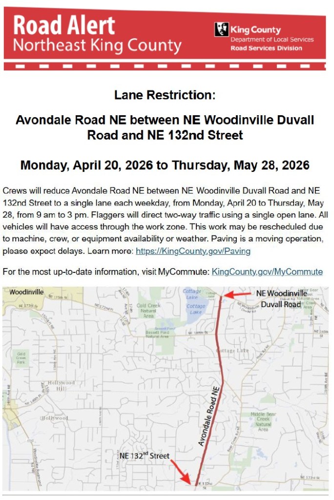 Crews will reduce Avondale Road NE between NE Woodinville Duvall Road and NE 132nd Street each weekday. See announcement for details.
